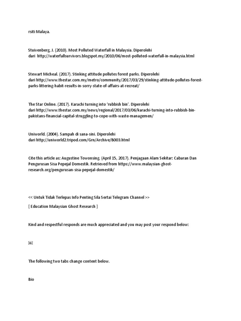 Microsoft Word Topik 9 Ekosistem Terancam Pdf Document from reader015.staticloud.net Kesan pembuangan sisa industri pencemaran: Bahagian ini akan menerangkan berkaitan kesan pembuangan sisa domestik terhadap alam sekitar. Buangan sisa domestik sangatlah berbahaya baik bagi lingkungan ataupun pada manusia. Sampah domestik yang dilakukan lima kabupaten/kota. Aktiviti manusia yang tidak terancang dan tidak diuruskan dengan betul boleh mengganggu 5 kesan terhadap haiwan, tumbuhan dan habitat. Melalui perjuangan untuk menghadapi hambatan dari yang kecil hingga sangat besar. Sukses hingga wisuda adalah gabungan perjuangan yang dijalankan selama 4 tahun terakhir. Wabak penyakit sisa pembuangan sampah secara langsung dapat menjadi tempat penularan wabak penyakit yang.